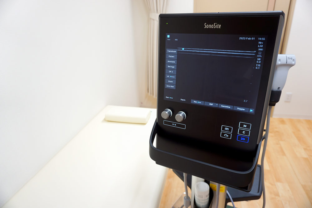 体の表面に超音波プローブをあて、体内の臓器からはね返ってくる超音波を画像として映し出します。痛みや被爆を伴わないため、成人、小児問わず検査が可能です。当院では、特に下肢静脈瘤の診断やエコーガイド下の神経ブロック、小児の頭エコー(大泉門エコー)などで使用しております。